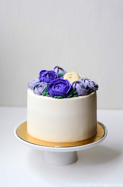 Every year for my Mom's birthday, I make her some sort of coffee-flavored cake. It started out with tiramisu cakes, mocha cake, and lately it's been coffee chiffon cakes. For her most recent birthday, I made coffee chiffon cake again, but this time covered with Swiss meringue buttercream and topped with purple buttercream flowers! (I've been super into make wreath cakes lately, and this was no exception!)