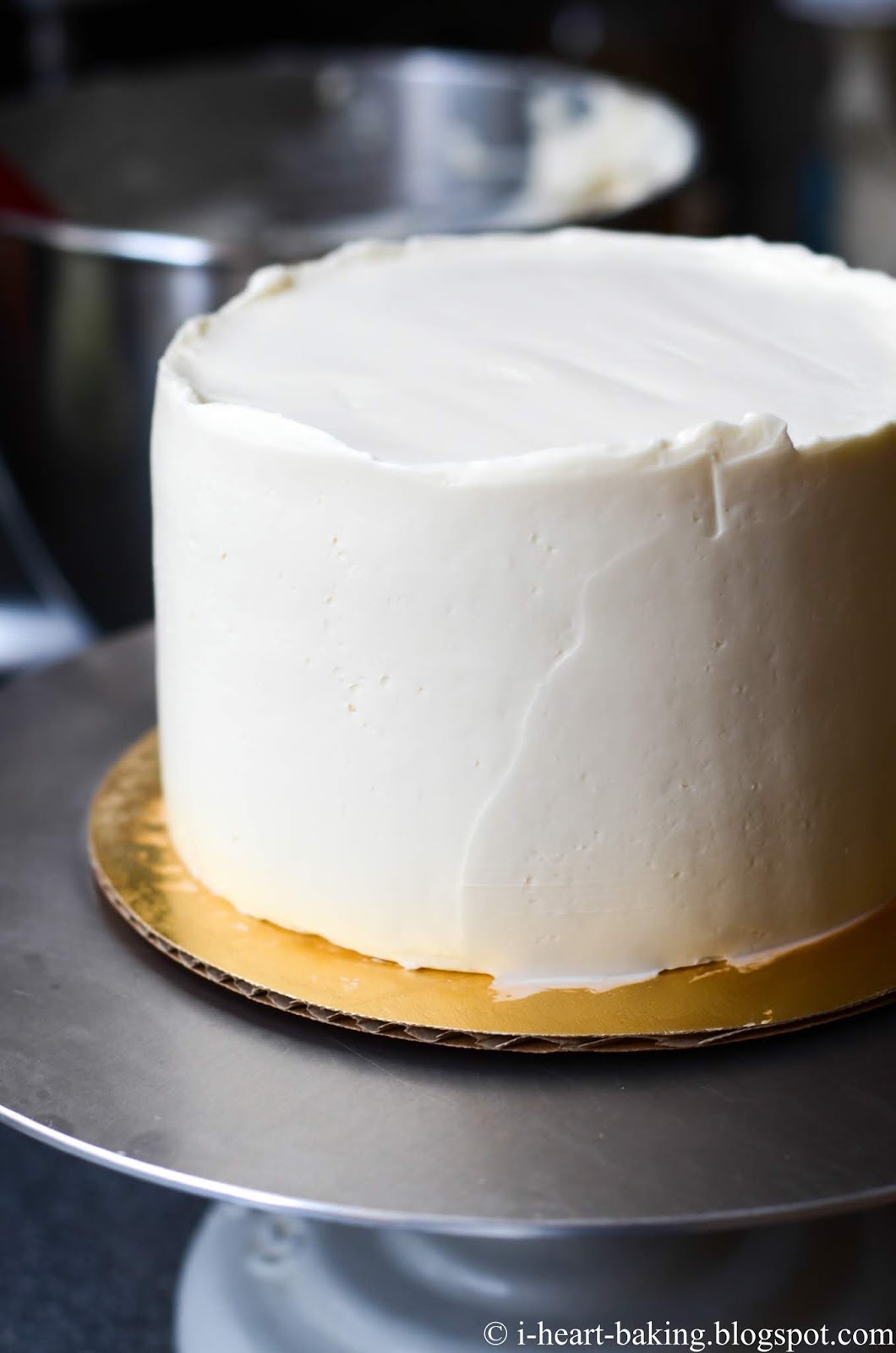 I typically do a quick crumb coat of frosting first, the let the cake chill in the fridge for 30 minutes, and then do a final coat of frosting, smoothing it all out with a long metal icing spatula.
