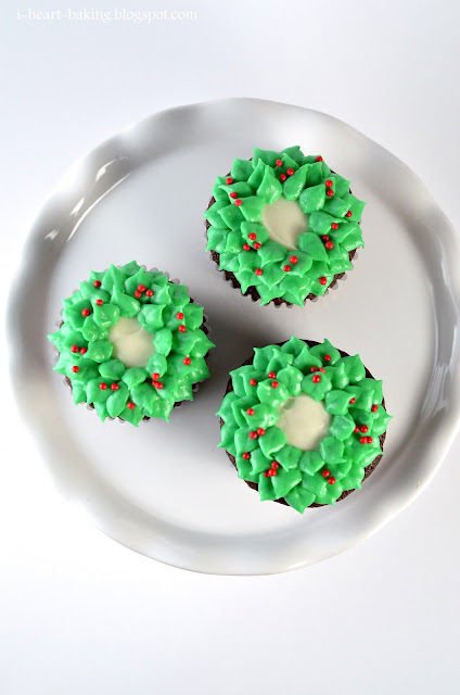 I saw these wreath cupcakes in my Martha Stewart "Cupcakes" book last year, but never had a chance to make them last Christmas.  So this year I had to make them!  I started by baking chocolate cupcakes, and then whipped up a batch of peppermint cream cheese frosting to top it with (basically a standard cream cheese frosting with about 1/4 - 1/2 teaspoons of peppermint extract added to it).