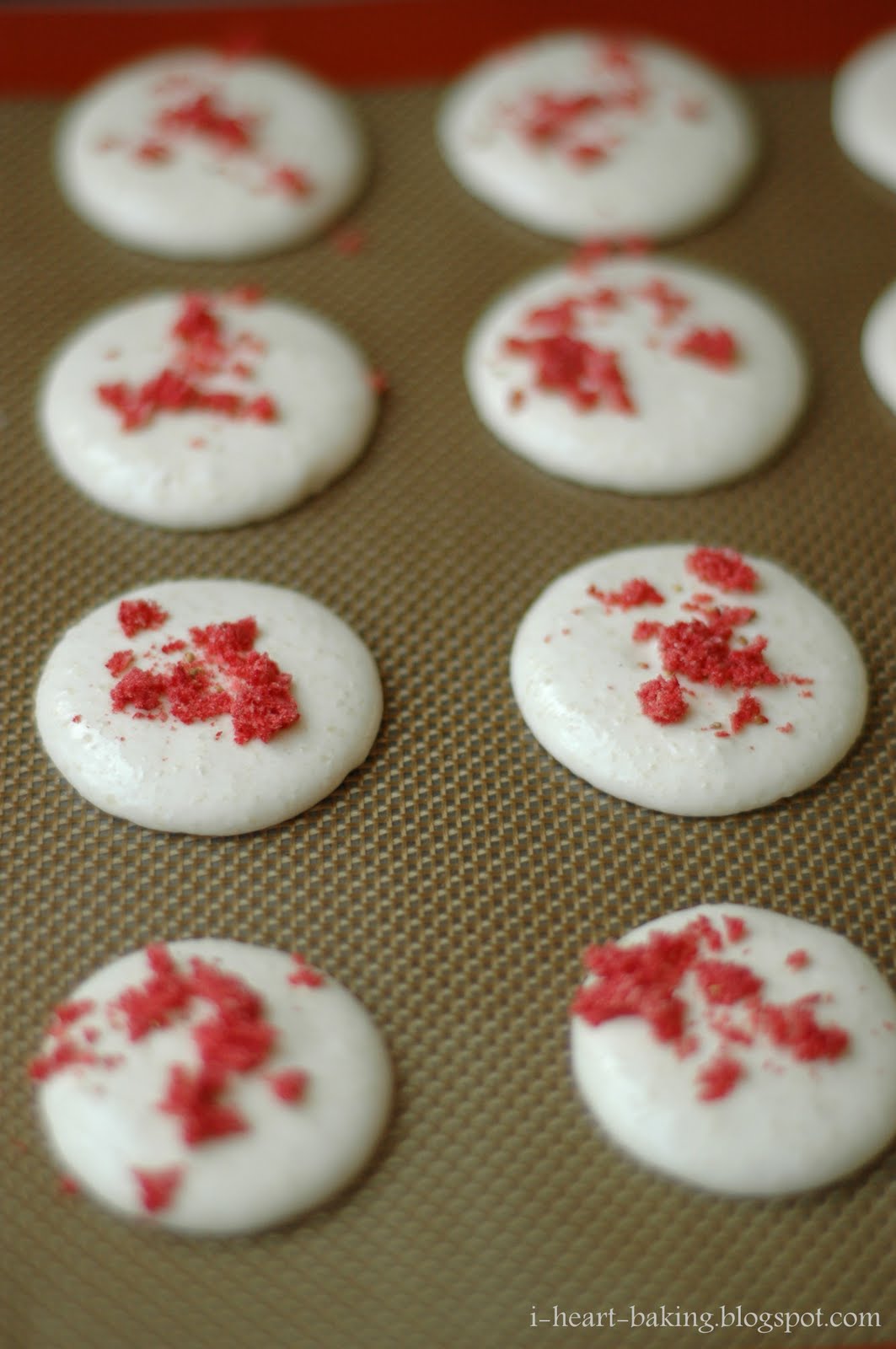 I've read that macaron shells are very senstivite to moisture, so I decided to use dehydrated strawberries (from Trader Joe's) that I ground up in my food processor. I sprinkled the strawberry bits on a few of the shells before baking, and thought the color contrast looked really beautiful!
