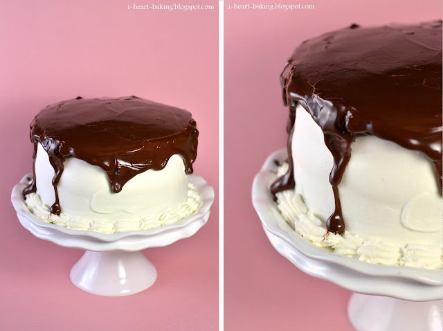 After covering my cake with whipped cream and piping a shell border on the bottom, I returned it to the fridge and then began to make my ganache glaze. I used an Ina Garten recipe, and it was so simple to make - just semisweet chocolate, heavy cream! I didn't want the glaze to melt the whipped cream on my cake, so I waited for it to come to room temperature first. But perhaps I waited too long, because by the time I spread it over my cake, it wasn't drippy enough to ooze down the sides!