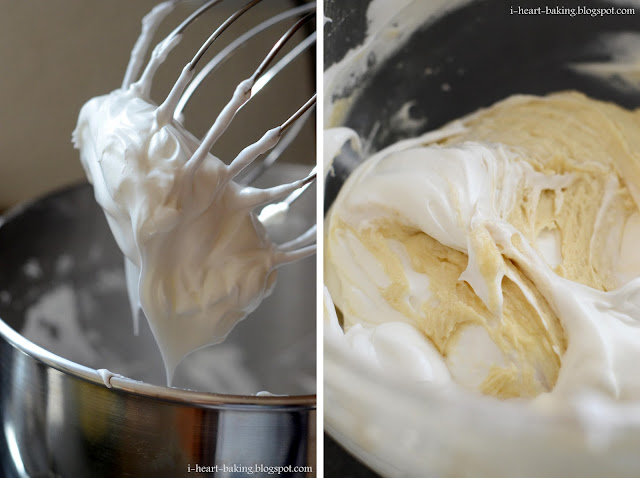 The frosting was definitely more complicated to make than a regular buttercream, because you have to heat egg whites and sugar to a certain temperature, and then whip them into a meringue.  Then you add butter a chunk at a time, until it comes together into a beautiful glossy buttercream.  But the extra effort was worth it, because it came out so silky and smooth, and wasn't too sweet at all.  I tasted the frosting right before I frosted the cake, and I was so excited because it tasted like whipped cream!  And it was so easy to work with because it was so light and fluffy and smooth.