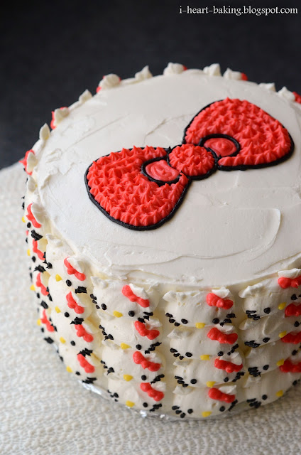And then came the fun part - piping Hello Kitty!  I piped her the same way I do on my Hello Kitty cupcakes and mini cupcakes (my favorite thing to pipe on cupcakes), except this time I piped her on the sides of the cake.