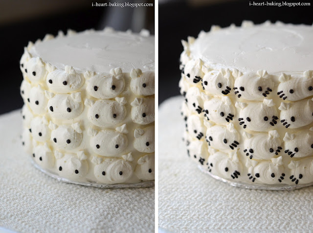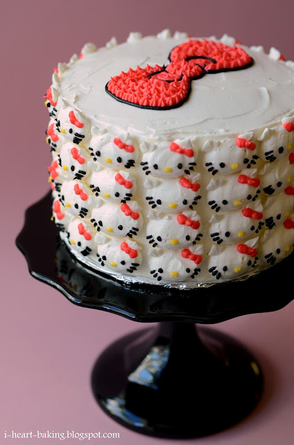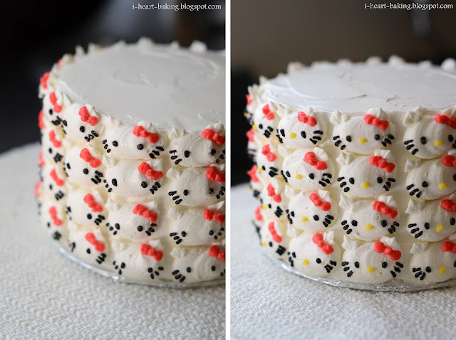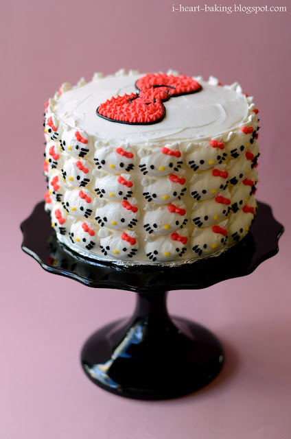 The idea actually came to me while I was piping roses onto this cake using I Am Baker's rose cake method - I had already made a few rose cakes before and suddenly thought to myself, I should cover a cake with Hello Kitty in the same way!  The only thing I couldn't decide was if I wanted the kitties to be staggered (like with the rose cakes), or in neat rows.  I decided to go with the neat rows.