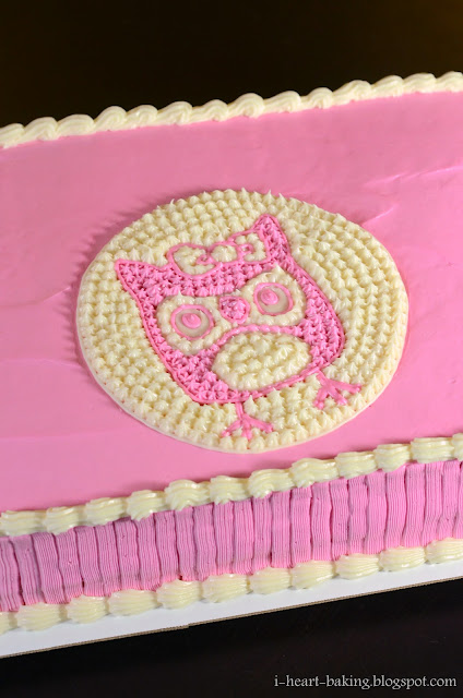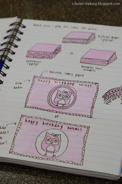 A few weeks before the party, I started brainstorming and sketching.  I finally decided to just do a simple pink cake with the pink and white owl logo, a white shell border, and vertical piped pink sides (sides similar to the carnival birthday cake that I did a while back).