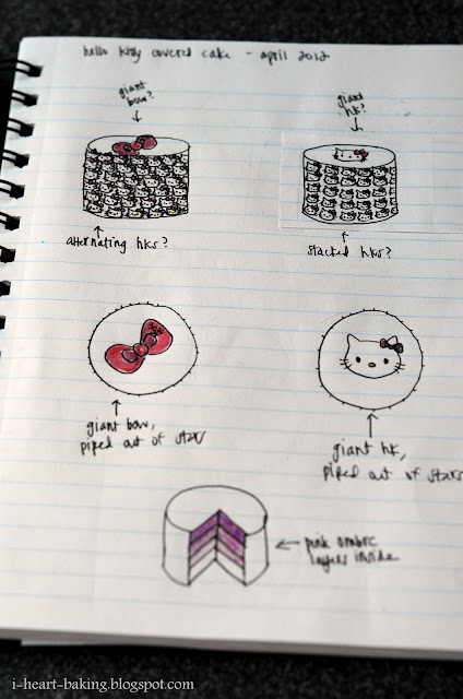 It was my birthday this past week, and of course I had to make a cake for myself!  For my birthday last year, I made this coffee chiffon charlotte with homemade lady fingers, which was such a fun cake to make because: a) I had been wanting to try making a charlotte, and b) I had never made homemade lady fingers before.  But this year, I wanted to make a Hello Kitty cake - I'm sure you all know about my obsession with Hello Kitty by now!  So I made a cake covered with lots and lots of Hello Kitty!  Here is the sketch of what I had envisioned: