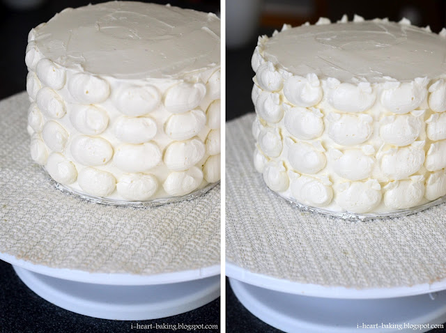 Then after a quick chill in the fridge, I used the rose cake method from I Am Baker to pipe my roses all over the cake.  (I've used her rose cake method a few times already, see here and here, and I still love the look every time).  I started by piping the top of the cake, then I piped the sides, and then I filled in any gaps with little swoops and swirls.