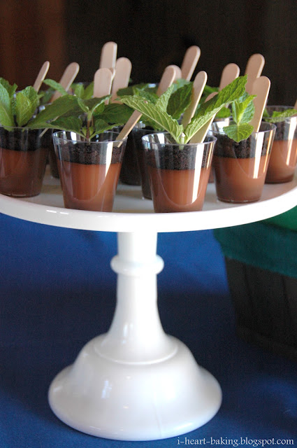 Next up were the potted plant chocolate puddings. I had decided to display them on either side of the dessert table - one one side of the table they would be stacked on a two-tiered ruffled cake stand, and on the other side of the table I used a single tier white milk glass cake stand.