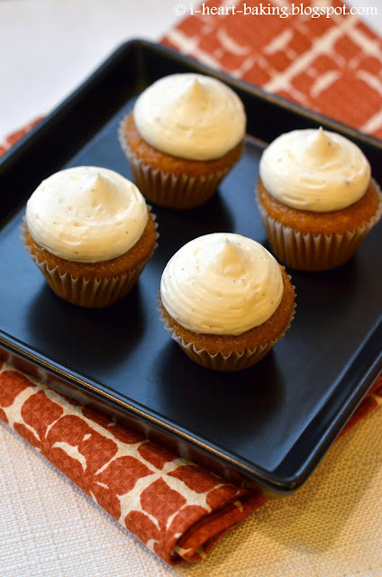Anyhow, sooooo I made these little mini pumpkin cupcakes four years ago! I had leftover pumpkin puree from something or other (I can't remember at this point!), and so I decided to turn that into mini cupcakes. Just for fun. So for the batter I used Martha Stewart's trusty pumpkin cupcake recipe from her "Cupcakes" book (also used for these Halloween Jack-o-lantern cupcakes, as well as this pumpkin layer cake with piped roses).