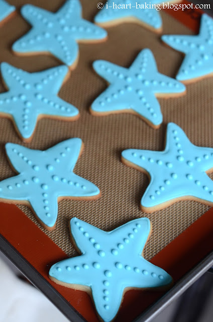 Then I did the same with the other half of the cookies except with blue icing. Once the icing had dried for several hours, I was ready to pipe on the details, including the brush embroidery. This is a technique where you pipe an outline with stiff icing, and then use a (slightly damp) food-safe brush to drag the edges of the outline towards the center, giving a cool painted effect.