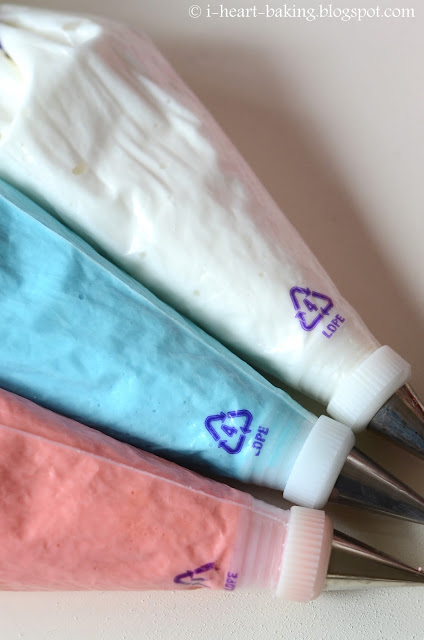 I started by making my favorite sugar cookies (recipe in my book, The Hello Kitty Baking Book!) and cutting out the cookies with a teapot cookie cutter. After baking them and letting them cool, I whipped up a batch of royal icing (recipe also in my book!). Using gel-based food coloring, I tinted a portion of the icing pink (using Americolor soft pink), another portion blue (using Americolor sky blue), and left the last portion white. Then with stiff pink icing in a disposable piping bag and a small round tip, I outlined half of the cookies in pink ...