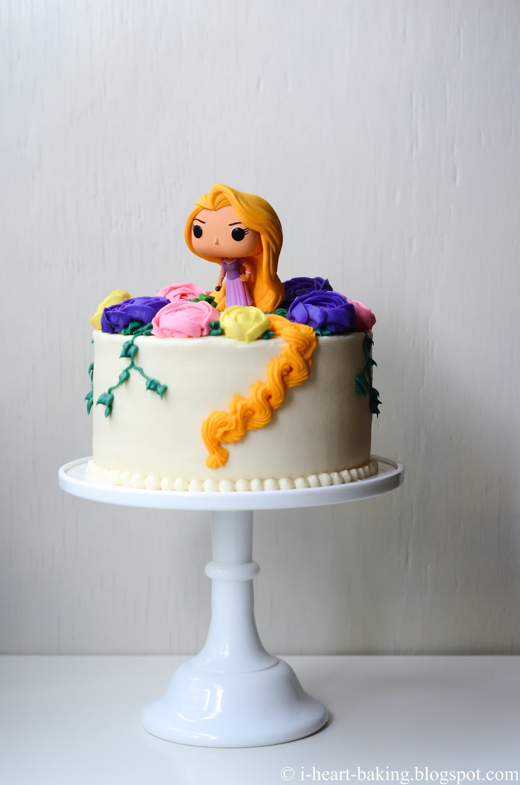 I've baked a lot of fun goodies for my friend Monica over the past few years, including pool party piggy cookies and a piggy cake, a chevron gender reveal cake, graduation cap cookies, a Hello Kitty pom pom cake, a circus carnival baby shower cake, and teapot cookies, but this one has to be my favorite so far! Her daughter absolutely loves the movie Tangled, so she asked me to make her a Tangled Rapunzel cake for her birthday! After discussing a few options, we decided that we would use this adorable Funko Pop Rapunzel doll as the cake topper, and I would continue Rapunzel's long hair down and around the cake.