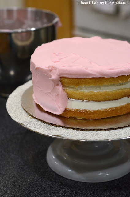 Then I whipped up a batch of cream cheese buttercream, colored most of it pink, and applied a quick crumb coat of frosting.