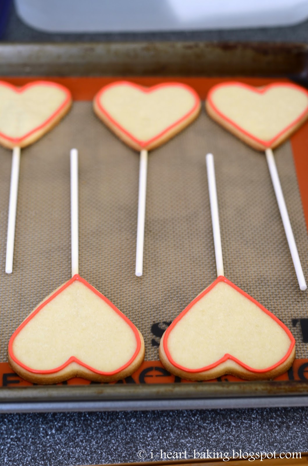 So using the same batch of sugar cookie dough (recipe in my book, The Hello Kitty Baking Book!), I cut out my hearts, and then placed them on top of lollipop sticks that I laid out on my baking sheet, gently pressing the dough to surround the stick. Then I baked them at 350F for 10-12 minutes until just golden.