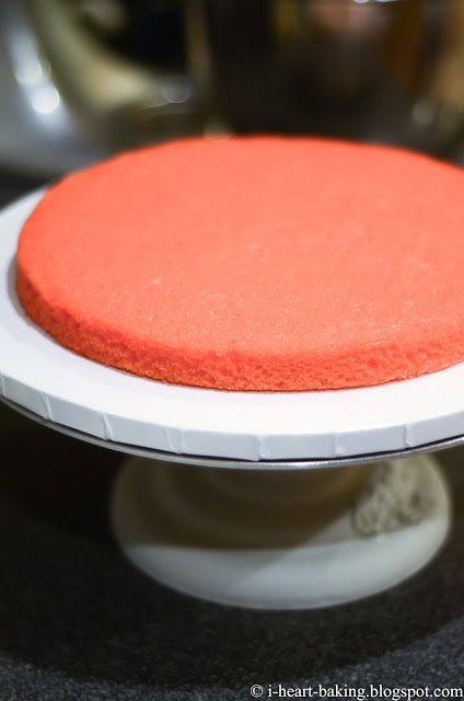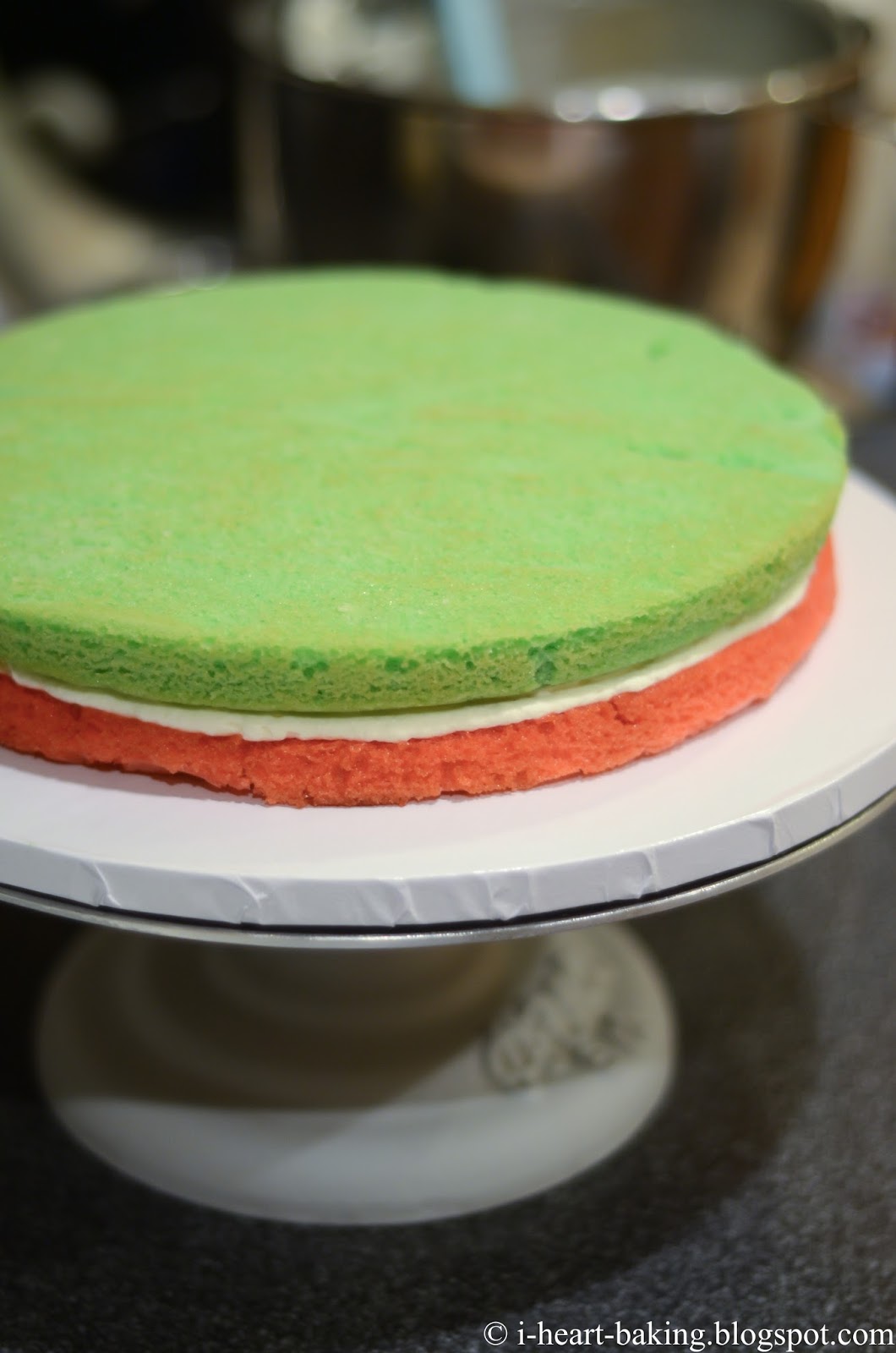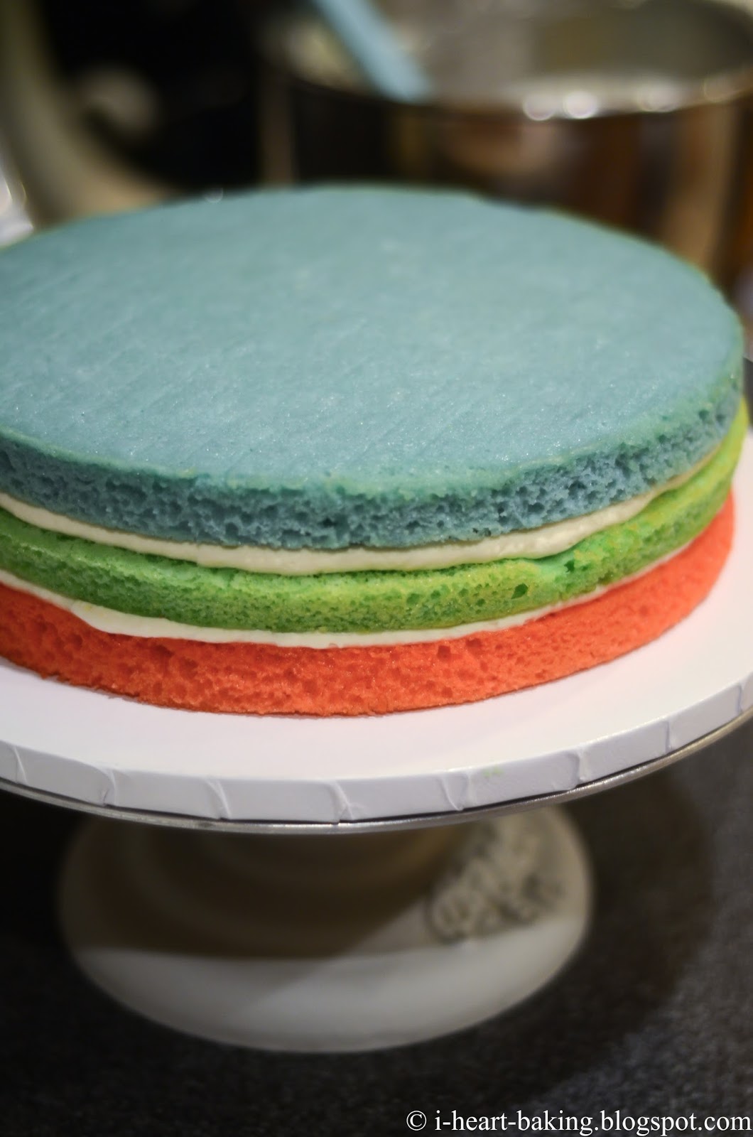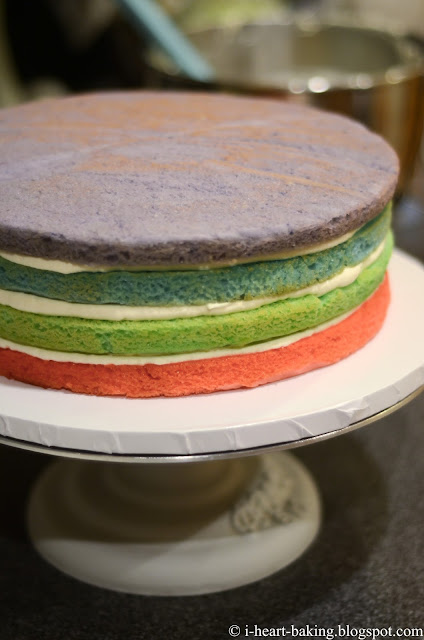 The Hello Kitty Baking Book!), divided it into four bowls, and colored each bowl of batter a different color (red, green, blue, and purple). Then I baked the colored batter in four different 10-inch round cake pans.