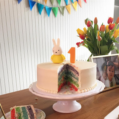 Tiffany already knew she wanted a miffy cake, and she wanted it to have rainbow insides. After a few emails back and forth, we decided on a design - just a plain white cake with a fondant miffy on top, wearing a yellow dress, next to a fondant orange #1. I couldn't wait to get started!