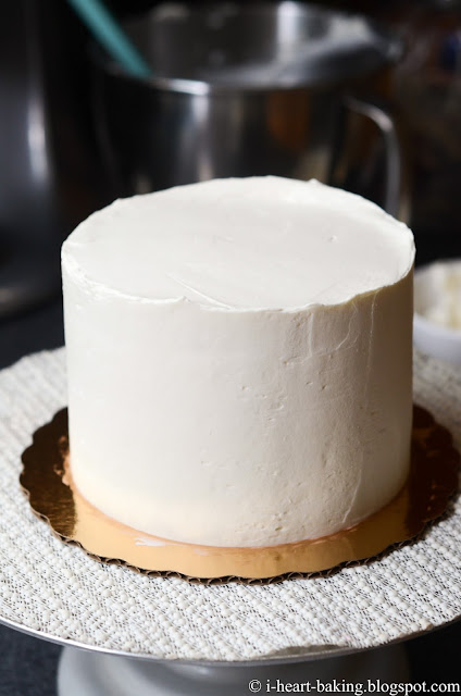 Once all four 6-inch cake layers were filled and assembled, I covered the top and sides with freshly whipped cream, and smoothed it out with an offset spatula.